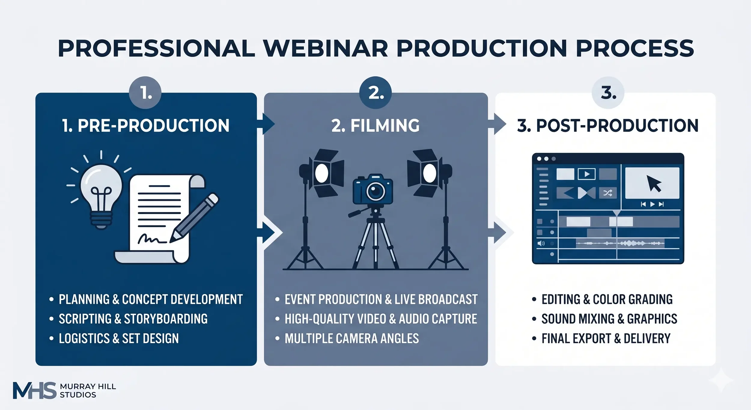 Pre-production. Planning, scripting, and any set design happen during the phase. You don’t need a full script or mapped-out idea to begin. Bring your idea to Murray Hill Studios, and we’ll go from there to start planning your webinar.